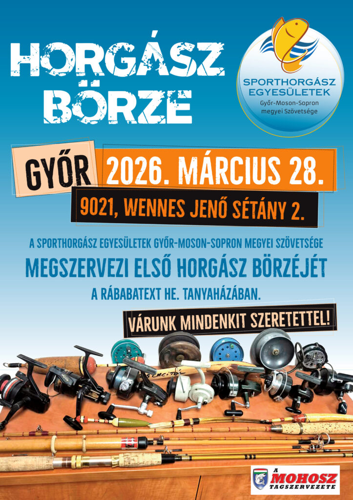 A Sporthorgász Egyesületek Győr-Moson-Sopron megyei Szövetsége megszervezi első HORGÁSZ BÖRZÉJÉT március 28-án a Rábatext HE tanyaházában (9021 Győr, Wennes Jenő sétány 2.).